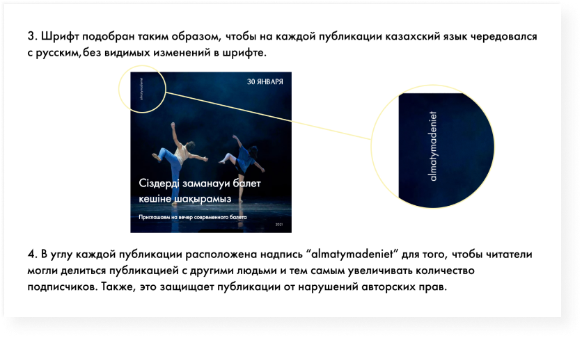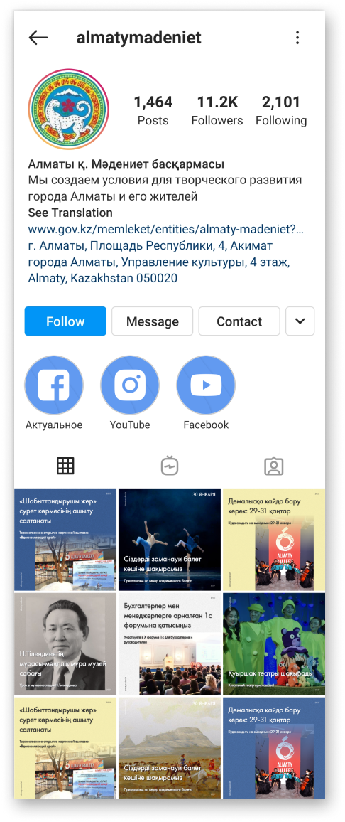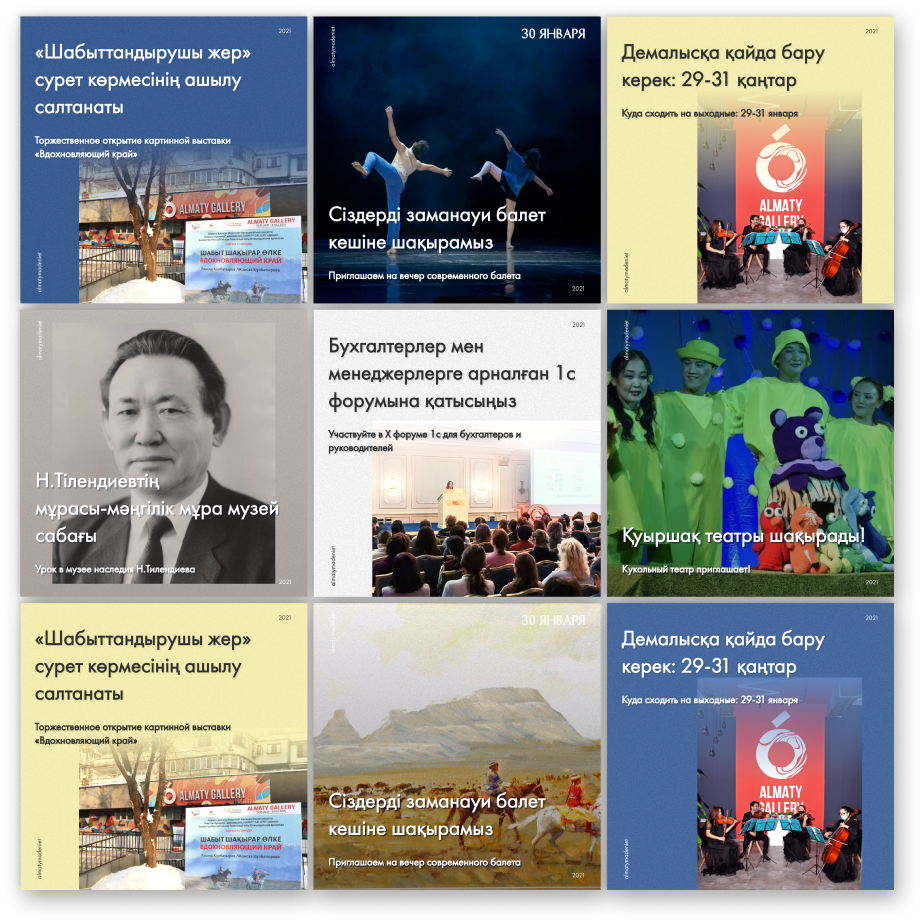 Создать новый стиль для инстаграма государственных органов, чтобы привлекать больше людей на культурные мероприятия, показывать многогранность города Алматы.